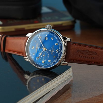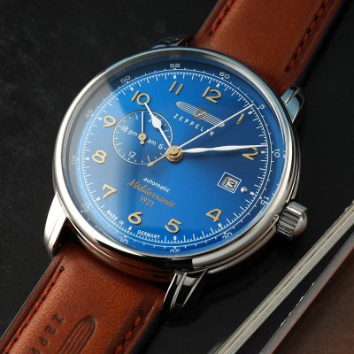 Diese Zeppelin Uhr hat ein Edelstahl Gehäuse mit einem Durchmesser von 40 mm und ist mit einem Armband aus Leder versehen. In der Uhr arbeitet ein Miyota Uhrwerk. Das Glas der Uhr besteht aus K1 Mineral - Glas.