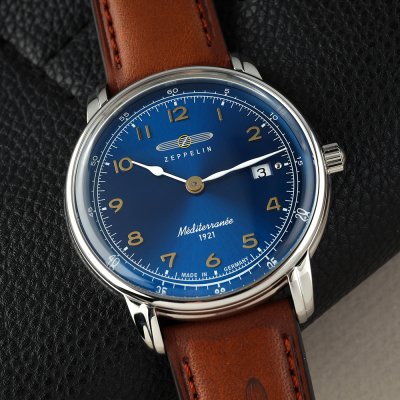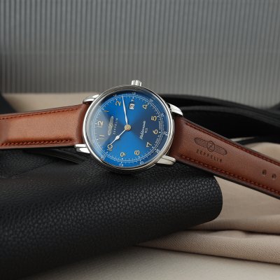 Diese Zeppelin Uhr hat ein Edelstahl Gehäuse mit einem Durchmesser von 40 mm und ist mit einem Armband aus Leder versehen. In der Uhr arbeitet ein ETA Uhrwerk. Das Glas der Uhr besteht aus K1 Mineral - Glas.