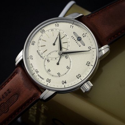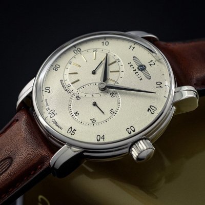 Diese Zeppelin Uhr hat ein Edelstahl Gehäuse mit einem Durchmesser von 42 mm und ist mit einem Armband aus Leder versehen. In der Uhr arbeitet ein Miyota Uhrwerk. Das Glas der Uhr besteht aus K1 Mineral - Glas.