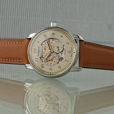 Diese Zeppelin Uhr hat ein Edelstahl Gehäuse mit einem Durchmesser von 42 mm und ist mit einem Armband aus Leder versehen. In der Uhr arbeitet ein Miyota Uhrwerk. Das Glas der Uhr besteht aus K1 Mineral - Glas.